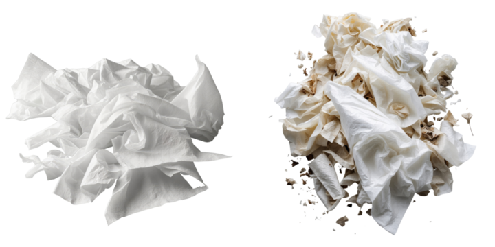 Close-up of crumpled white tissue paper waste on a transparent background showcasing different textures and shades of used tissues completely isolated for conceptual purposes