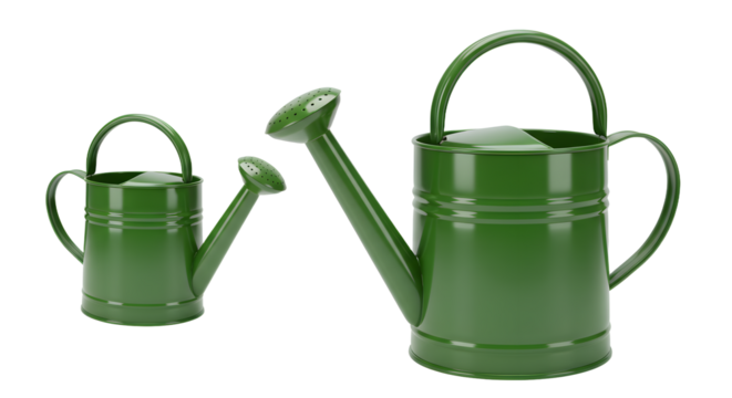 Two green metal watering cans isolated on white background, gardening tools for plant care and watering