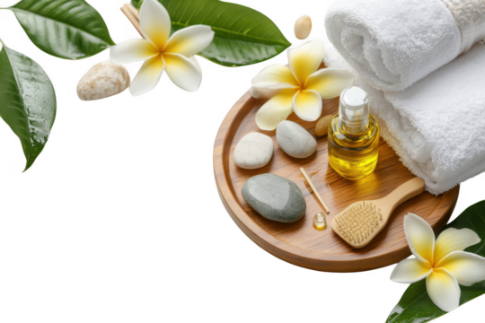 Relaxing spa arrangement featuring elegant towels and soothing essential oil with blossoms isolated on transparent background