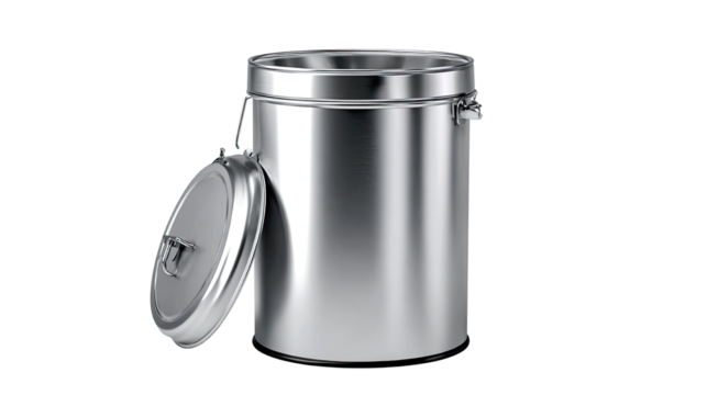 shiny metal trash can with open lid on white background