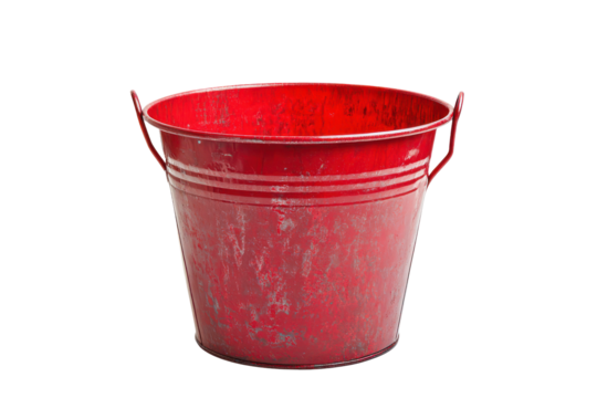 Vintage red metal bucket with handle isolated on transparent background. Red metal bucket isolated on white background.