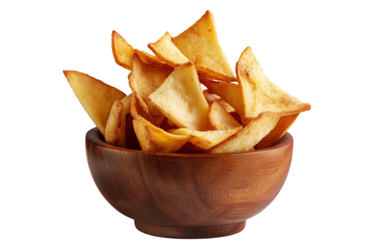 Pile of Tavioka or Cassava chips served in rustic wooden bowl, isolated on white transparent background, concept of Fijian snack food
