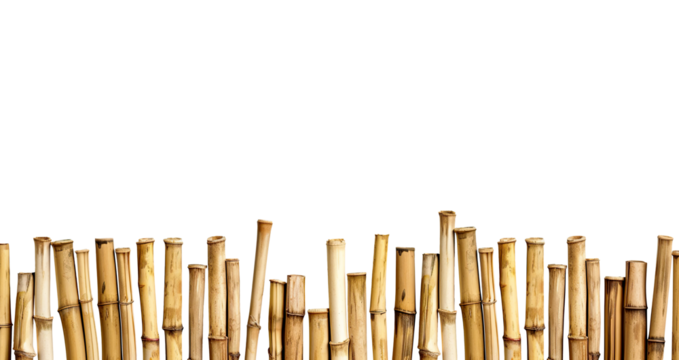Bamboo stems border. Bamboo fence, paling. Row of natural bamboo stems of varying heights, arranged vertically. Isolated cutout on transparent or white background.