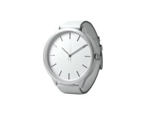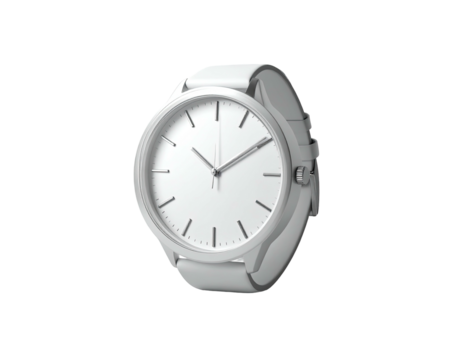 Modern smartwatch with a white strap displaying a minimal clock face, angled
