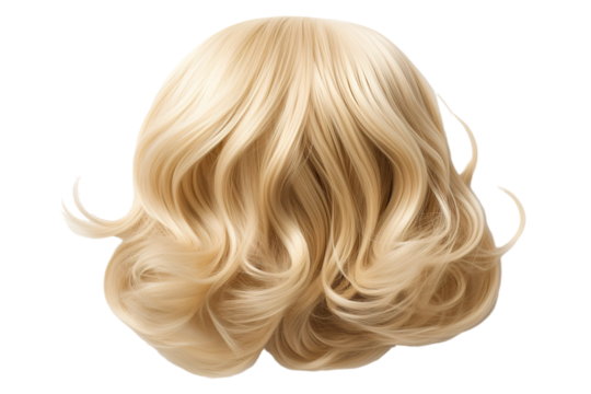 Stylish hair wig with trendy design isolated on background, front view, fashionable hairstyle concept.