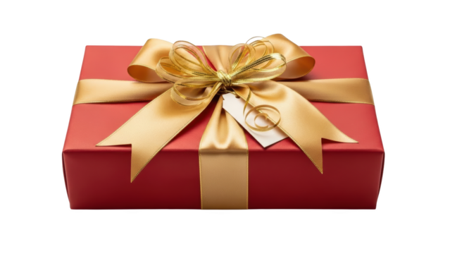 A beautifully wrapped red gift box with a golden bow on top against a white background for celebration