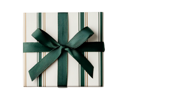 Square gift box with striped wrapping and a dark green ribbon bow on white backdrop