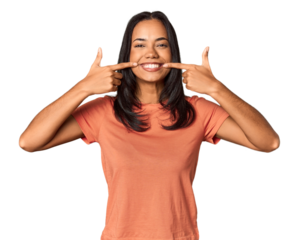 Young Filipina with long black hair in studio smiles, pointing fingers at mouth.
