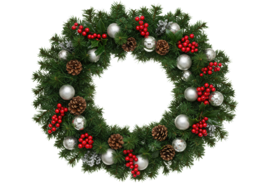 Lush, hand-tied christmas garland featuring vibrant noble fir, red holly berries, pine cones, and silver/white glass baubles, isolated on a white studio background. Concept of elegant festive