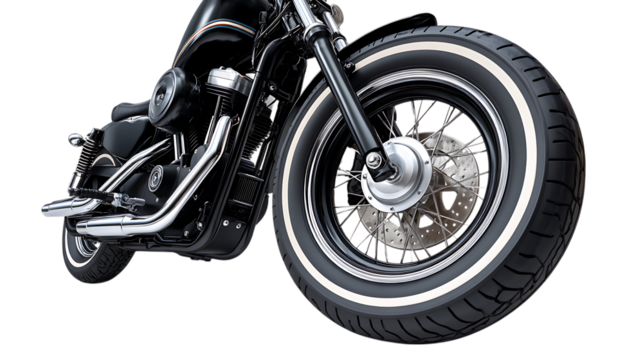 Detailed view of a classic black motorcycle engine and front wheel with whitewall tire isolated on transparent background