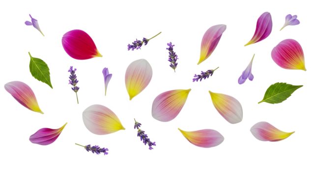 A serene floral arrangement of pastel-hued petals and lavender sprigs scattered against a pristine white background