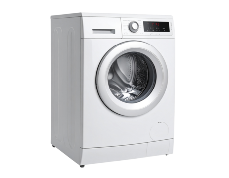 A white washing machine with silver elements, on the front of which is an LED display and control panel. Transparent background PNG