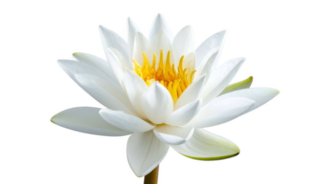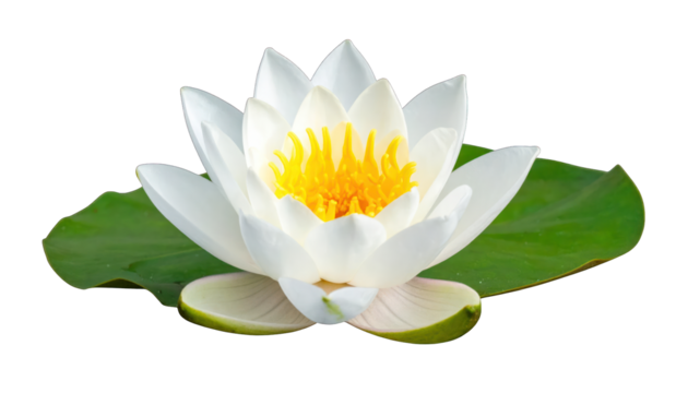 A pristine white water lily, yellow center, green leaf, isolated on transparent background