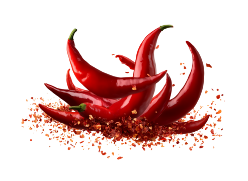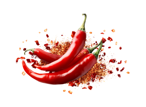 group Red and hot Falling bursting chili peppers whith chili pawder on islated transfarent background, PNG.