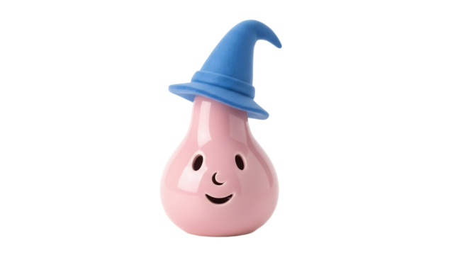 Pink light bulb with a blue wizard hat PNG isolated on transparent background, whimsical design element for creative projects