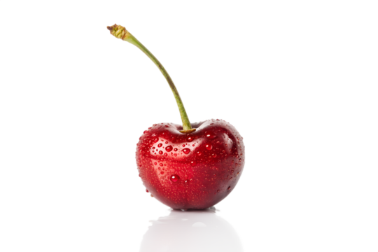 A single ripe cherry glistening with water droplets, isolated on a clean white background, showcasing its fresh, healthy, and vibrant natural beauty
