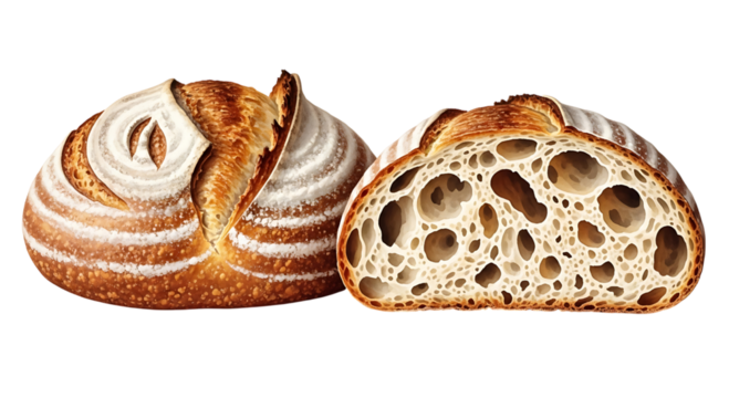 Artisan sourdough bread, one whole loaf and one sliced in half, isolated on transparent background