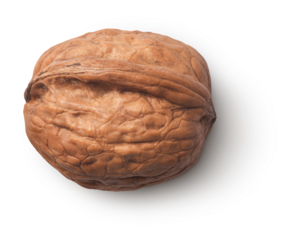 Walnut isolated png. Unpeeled walnut with a half on white or transparent background. Perfect retouched two walnuts no background. Side view nut. Full depth of field.