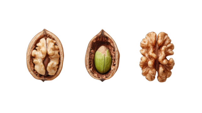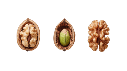 Walnut halves and whole walnut isolated on a transparent background