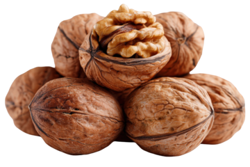A pile of whole walnuts with one cracked open on isolated transparent background