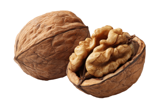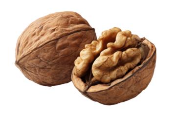 Two whole walnuts displayed against a transparent background
