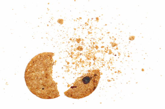 Broken wholegrain biscuit with rolled oats and fruit, crumbs isolated on white