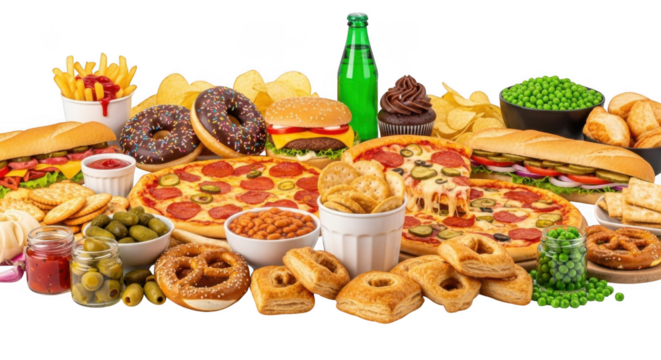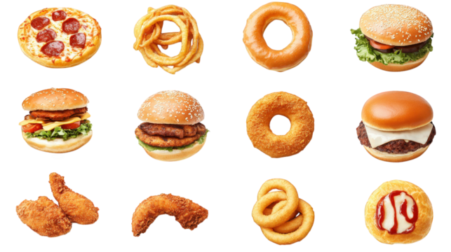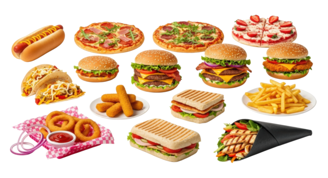 A diverse collection of fast food items: hot dogs, pizzas, burgers, tacos, nachos, fries, onion rings, panini, on a transparent background with uniform studio lighting, concept for culinary abundance