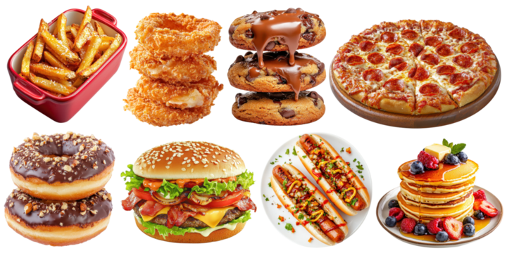 Assorted fast food items including pizza, burgers, hot dogs, donuts, pancakes, fries, onion rings, and cookies cut out isolated transparent PNG