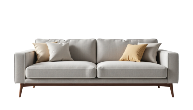Modern sofa, beige fabric, wooden legs, comfortable, living room, minimal style, cozy