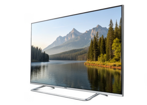 Realistic LED TV screen isolated PNG on transparent background — high-resolution modern smart television display, front view with slim black bezel, clean studio cutout for product mockups, UI previews