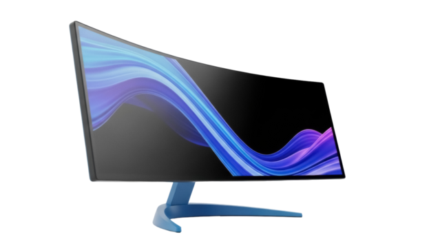 Curved widescreen monitor with metallic stand isolated on a transparent background