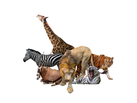 Wild Zoo Animals on transparent background. png file. Composite of a large group of wildlife zoo animals together over a white horizontal web banner or social media cover.