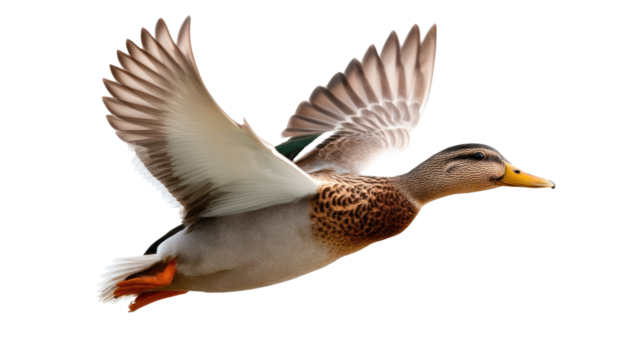Brown female mallard duck collection, portrait, flying and standing, isolated on a transparent background