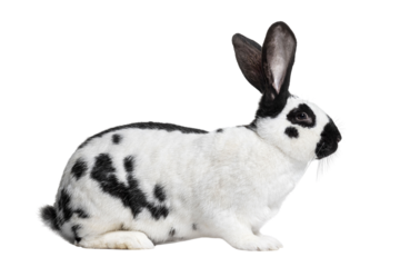 Side view of a Checkered Giant rabbit, isolated on white