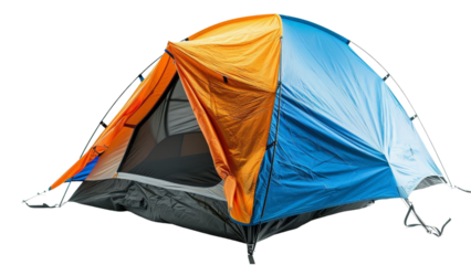 Blue dome camping tent with open entrance on transparent background for outdoor adventure and travel design