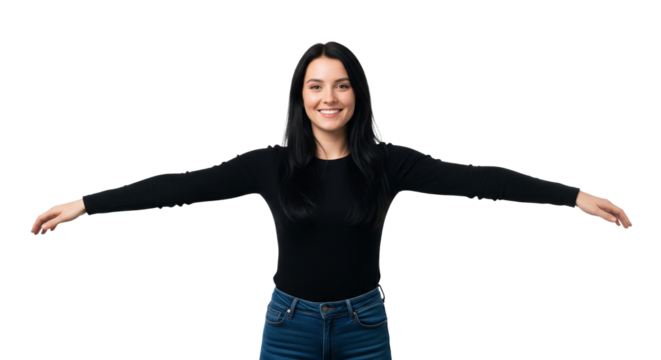 Schwarzhaarige  Frau – Willkommen-Geste, transparenter Hintergrund, PNG