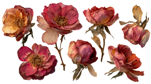 Collection of Seven Dried Rose Blossoms with Wilting Petals and Stems, cut out transparent