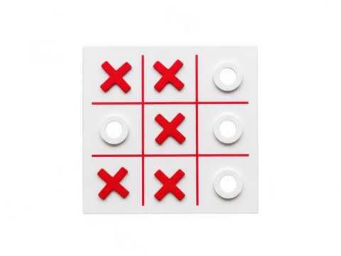 A 3x3 tic-tac-toe game board with red xs and white os isolated on transparent background