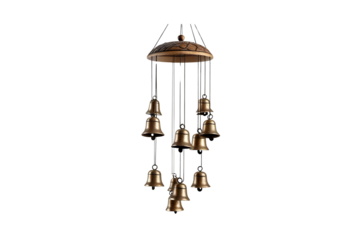 Ornate hanging wind chime bells with traditional floral design on a transparent background