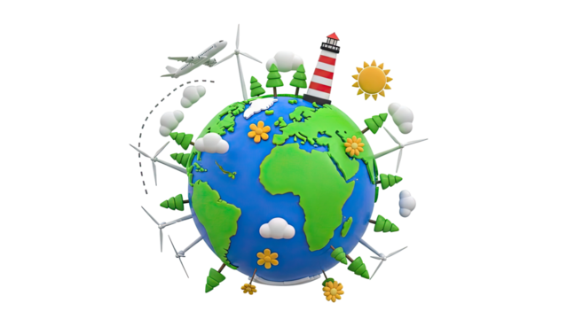 Cartoon Earth with Wind Turbines, Airplane, and Lighthouse