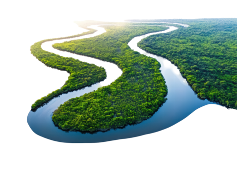 PNG of A serene landscape featuring a winding river surrounded by lush greenery and rocky outcrops, evoking tranquility.