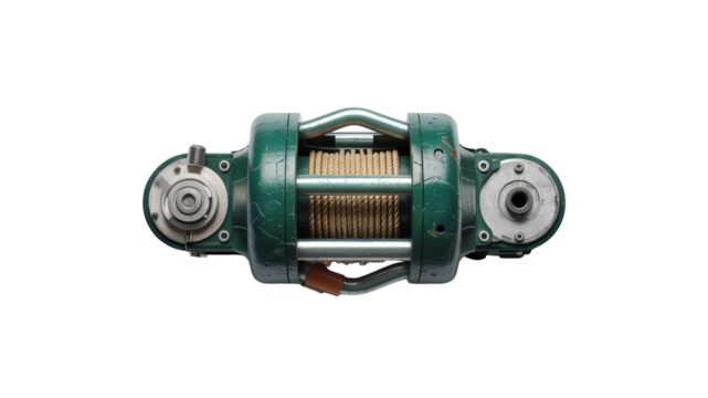 Rusty winch mechanism isolated on a transparent background view, close.