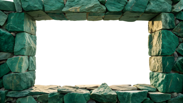 Weathered green sandstone window opening with natural cracks and aged patina finish details, isolated on a transparent background