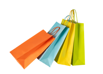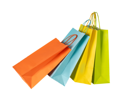 Woman with shopping bags and phone wearing yellow jacket smiles on transparent background