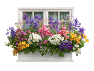 Charming white wooden window with a rustic planter box overflowing with colorful petunias geraniums and other summer flowers.