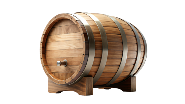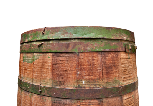 Wooden barrel, old cask or keg, holding liquid like wine or beer, historical storage container, blank background