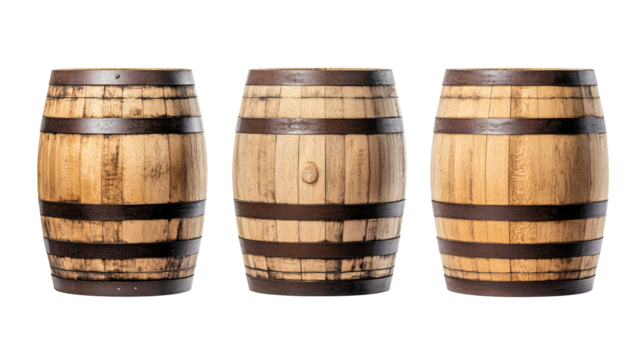 Wooden Barrels: Collection of Oak Barrels, Wine Barrels, Whiskey Barrels, Beer Barrels, Various Angles, Barrel Views, Wooden Casks, Beverage Containers PNG, Transparent Background.
