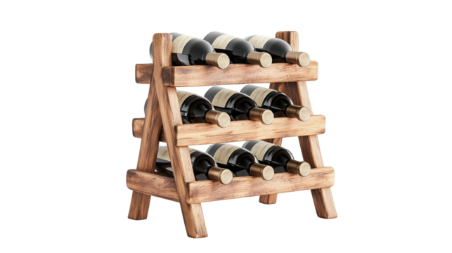 Wooden wine rack holding bottles of wine a rustic display on a white background Simple elegant isolated on transparent background
