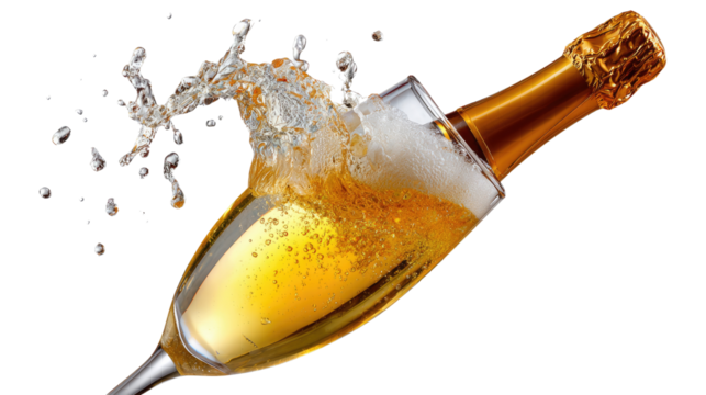 Effervescent Champagne: A champagne bottle is artfully poised, pouring into a glass, with sparkling bubbles, and a splash, perfect for celebration