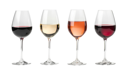four Different kinds of wine in wine glasses isolated on transparent background